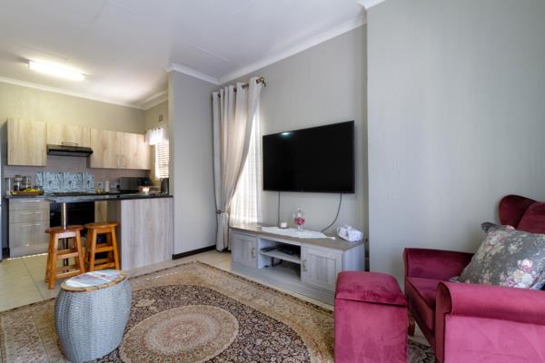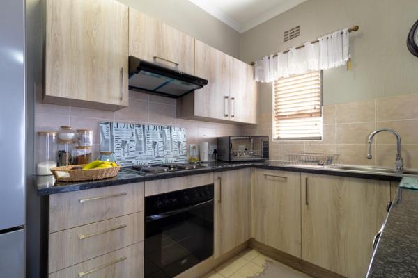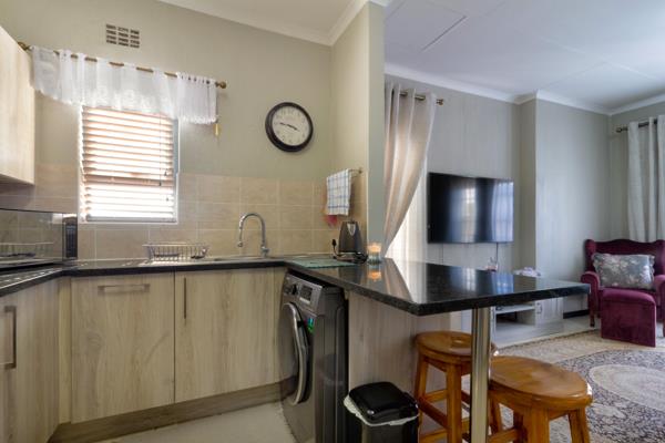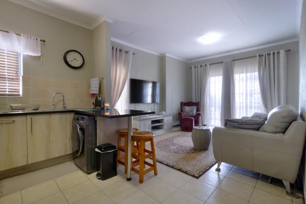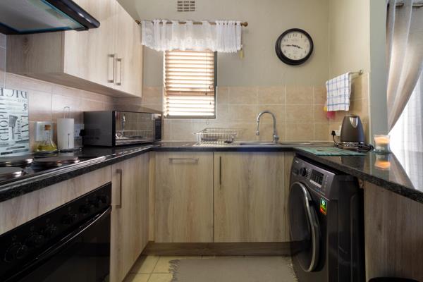 This warm and sunny corner unit also consists of a modern open plan kitchen with lots of built in cupboards and space for 2 appliances.