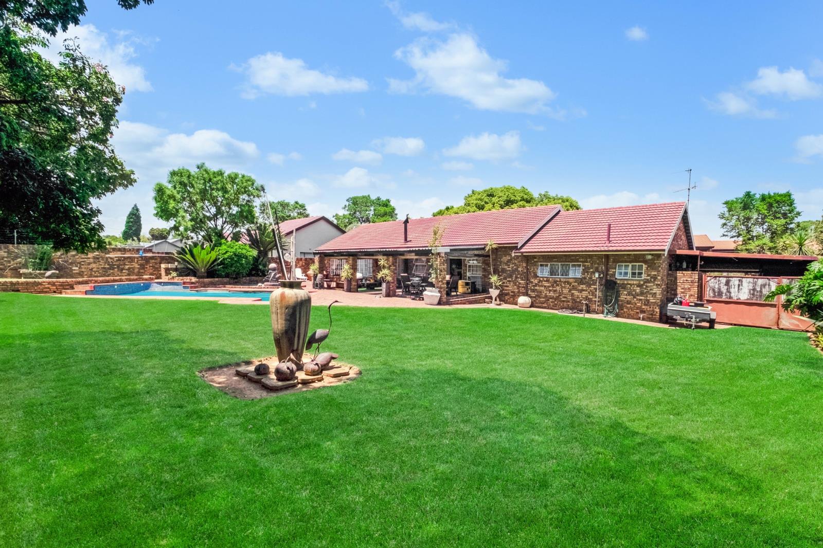 The property boasts a lush, established garden surrounded by mature greenery. A covered patio overlooks a sparkling swimming pool, creating an inviting, resort-style atmosphere suitable for weekend entertaining, summer braais, and leisurely afternoons. The expansive lawn provides a secure area for children and pets to play.