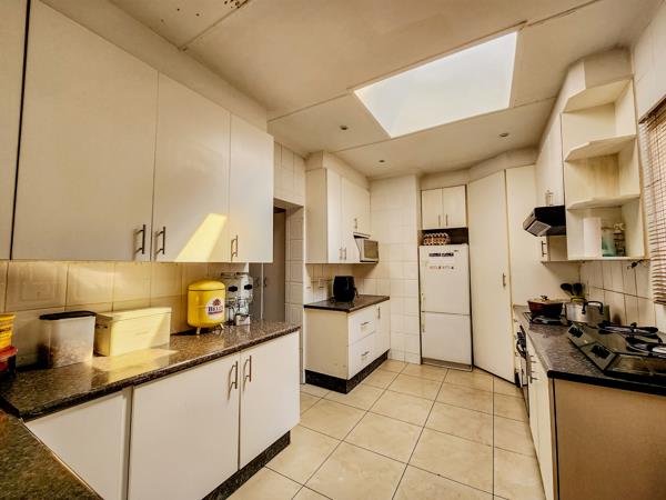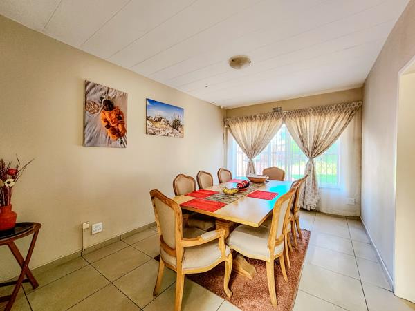 The dining area accommodates an eight-seater table, making it perfect for hosting guests. A well-appointed kitchen boasts granite countertops, ample storage, a scullery, and a large corner pantry, ensuring convenience and organization. It features a four-plate electric hob, under-counter oven, and extractor fan, complemented by a separate laundry that easily accommodates top-loader appliances.