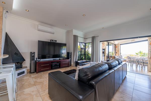 A stylish braai room with built-in gas braai opening onto an elevated deck and heated infinity pool overlooking spectacular panoramic views