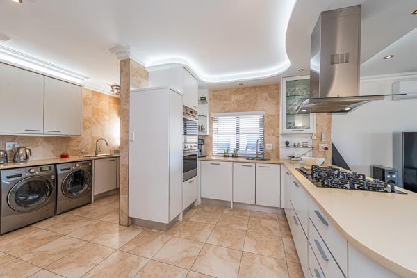 The open-plan lounge and dining area flow effortlessly into a designer kitchen featuring a premium SMEG gas stove, extra-depth custom fridgefreezer, a spacious walk-in pantry, and a separate scullery creating the perfect environment for both everyday living and entertaining.