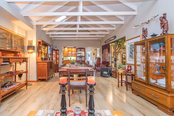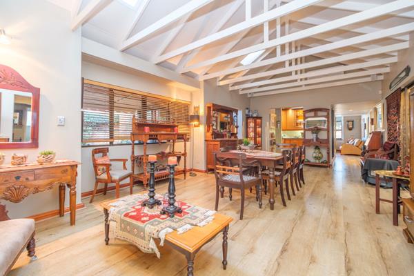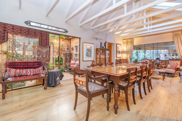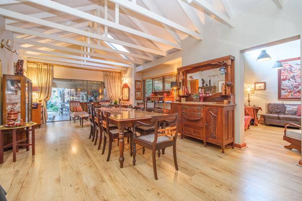 The open-plan living area boasts a seamless indoor-outdoor flow, enhanced by a sun-drenched patio featuring a built-in braai for entertaining family and friends. The eat-in kitchen is a chefs delight, complete with a breakfast nook, and a generous pantry. Theres ample storage throughout, including a dedicated storage room and built-in closets, ensuring every item has its place.