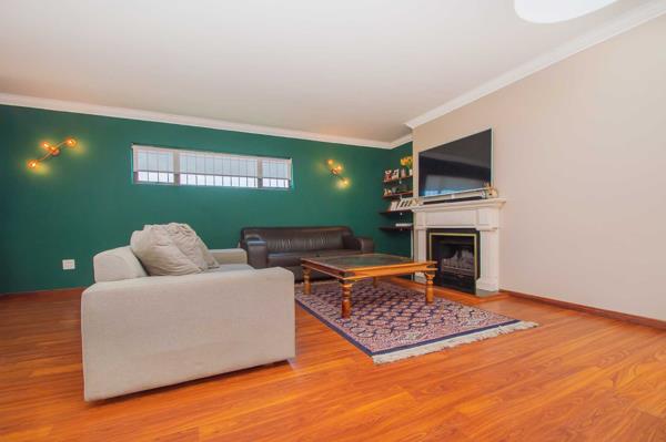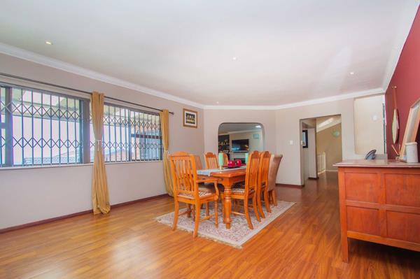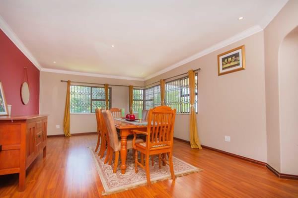 The theme continues into the double-volume, open-plan dining room area featuring laminated flooring, modern cornices and trim, down-lighting which can easily accommodate a 12-seater dining suite.