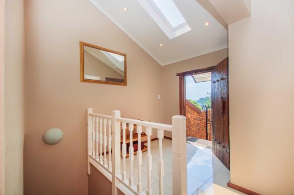 The wooden entrance pivot-door leading onto the split level stair casing features a sky light for natural lighting, down lighting and balustrades which makes for a stunning introduction and warmly welcomes you into the property.