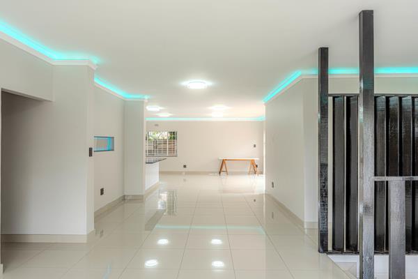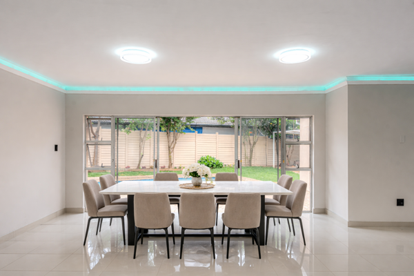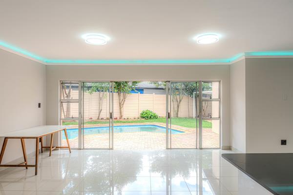The dining and lounge spaces comfortably accommodate a full dining setup and lounge suite, while large sliding doors allow natural light to flood the interior and open out onto a private garden featuring a solar-heated swimming poolperfect for indoor-outdoor living.