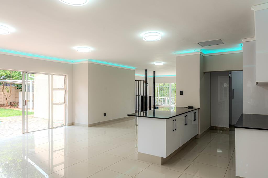 The open-plan design allows the kitchen to flow effortlessly into the dining and lounge areas, which are spacious enough to accommodate an 8-seater dining table and a large lounge suite with ease. Large sliding doors flood the living areas with natural light and open out onto a private garden space with a pool, creating excellent indooroutdoor flow ideal for entertaining or relaxed family living.