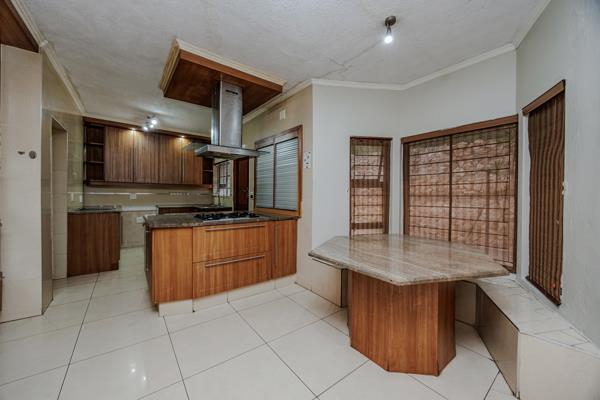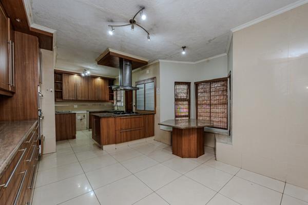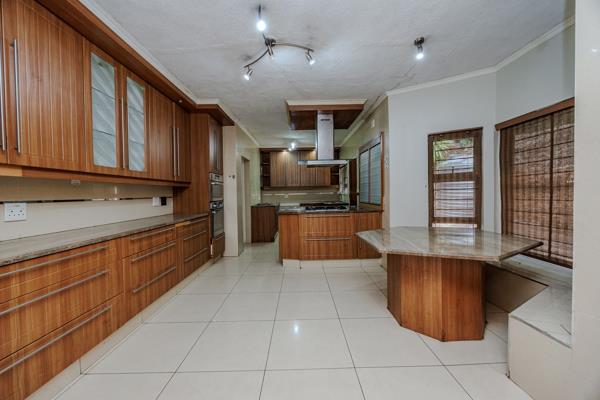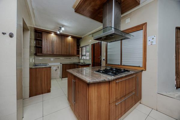 The interior layout is meticulously designed for comfort and functionality, featuring two generous lounges and a dedicated dining room, providing ample space for both formal entertaining and relaxed family gatherings. The well-appointed kitchen boasts extensive wooden cabinetry, granite-style countertops, and a central island with integrated appliances, ensuring a sophisticated culinary experience. Tiled flooring throughout maintains a clean and cohesive aesthetic.