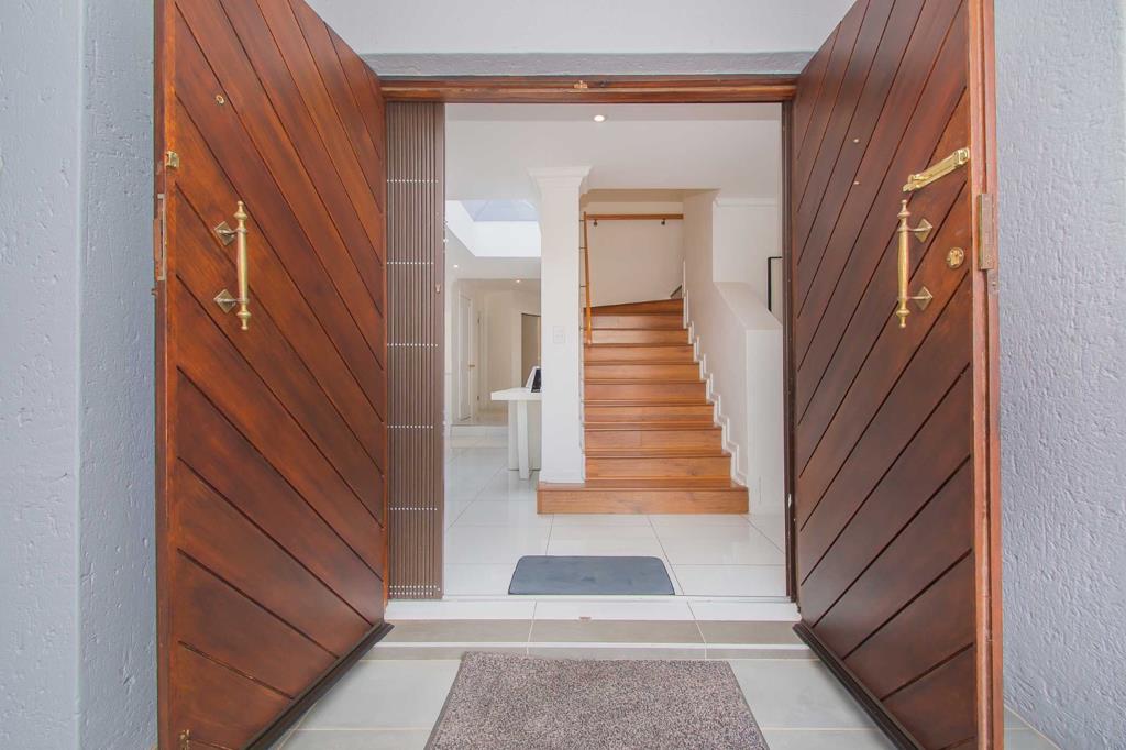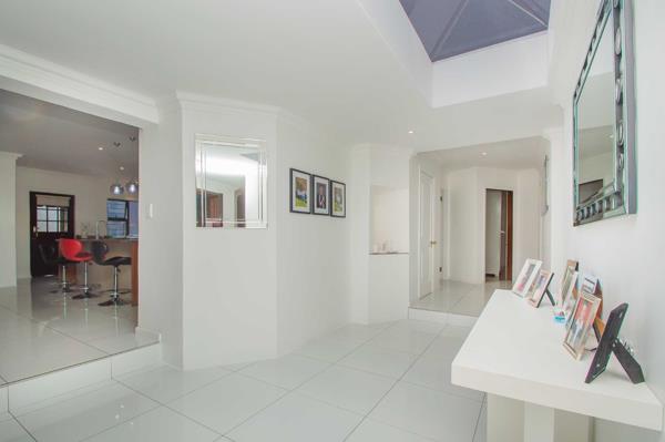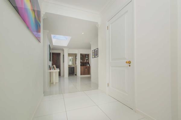 The double wooden entrance doors open into a grand, all-white entrance hall, where large-format porcelain tiles, sleek modern cornices and refined trim set the tone for the home. Soft downlighting and a striking skylight flood the space with natural light, creating an absolutely stunning first impression.
