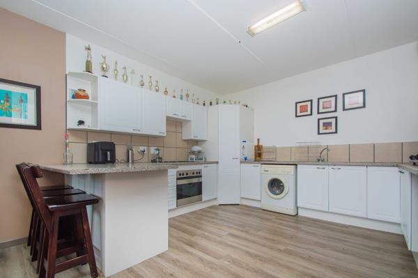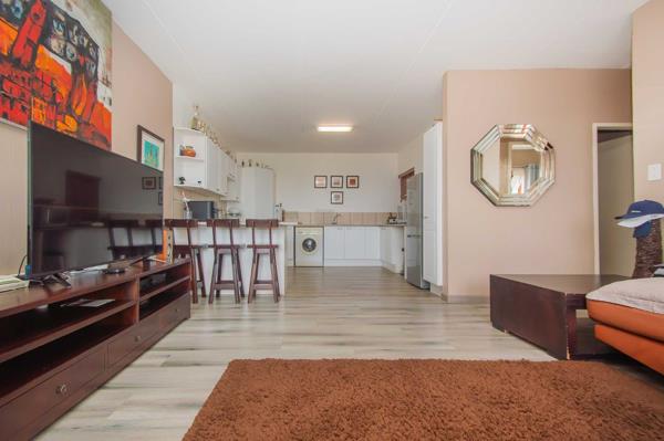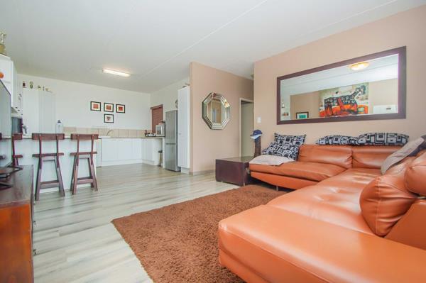 The open-plan lounge and kitchen create a seamless living space designed for both comfort and practicality. The kitchen offers generous cupboard space and modern finishes, flowing effortlessly into the living area. Sliding doors open onto a private balcony the perfect spot for morning coffee or winding down at sunset.