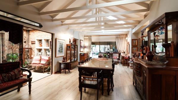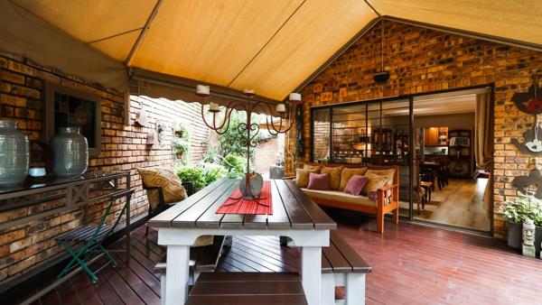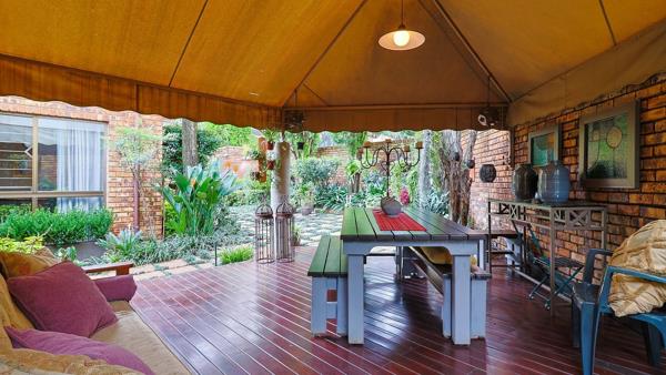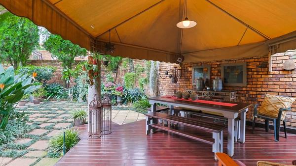 Sliding doors open from the dining room to a charming deck with a canvas awning, offering a peaceful outdoor retreat surrounded by a beautifully landscaped garden. The garden features lighting with timers and daynight switches to create an enchanting atmosphere in the evening.