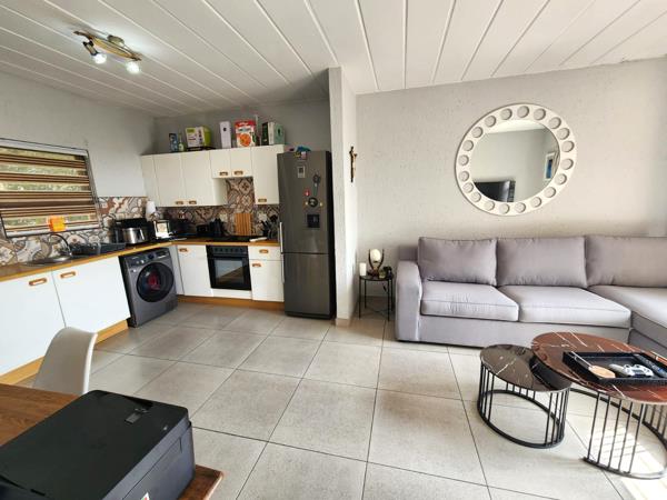 New tiled, spacious open plan lounge and kitchen with door to balcony. Space for a dining table