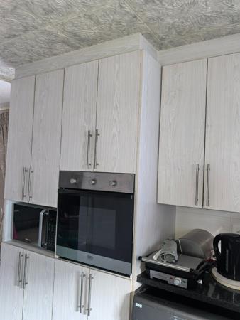 A beautiful specious kitchen fit for a chef, with a double door fridge space and ample cupboard space for all your kitchen utensils
