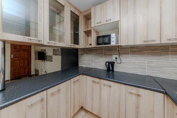 This home offers ample storage, a double stainless steel sink, and a dedicated microwave space, all arranged in a practical U-shaped layout. Tiled flooring extends throughout these communal areas, ensuring easy maintenance and a cohesive aesthetic. The living space is functional with neutral walls. A north facing living room.