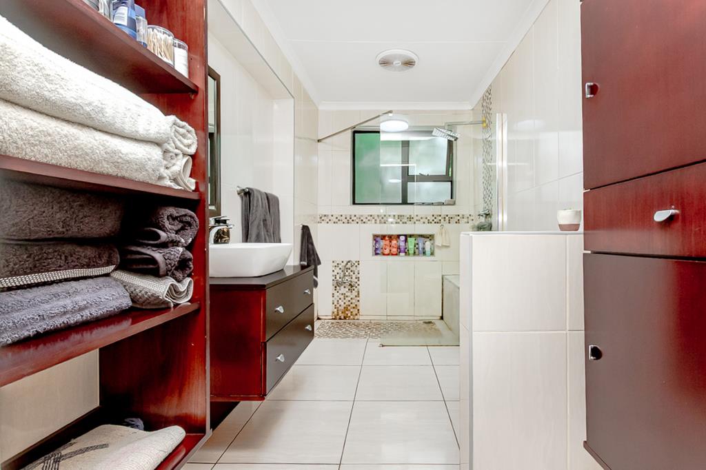 The massive kitchen is perfect for family gatherings and features an electric oven with an extractor as well as a gas stove, a fridge plumbed into the municipal water, a large pantry, double sink and space for another plumbed appliance. The copious amounts of cupboard space ensures that the countertops remain uncluttered always neat and tidy.