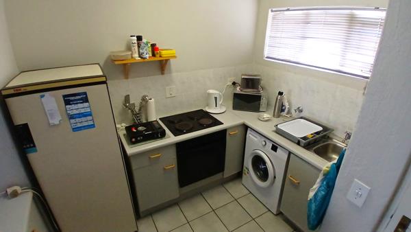 Kitchen with decent cupboard space, a breakfast nook and a washing machine inlet.