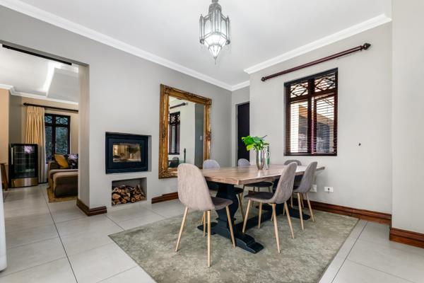 An enclosed patio with stacking doors further extends the living space, making for comfortable living. The open-plan kitchen is modern and well-equipped, seamlessly integrated with the lounge area to create a warm and inviting atmosphere. A slow burning combustion fireplace, strategically placed, adds to comfort and warmth when needed. The ground floor also includes a formal lounge and a dining room, perfect for hosting guests.
