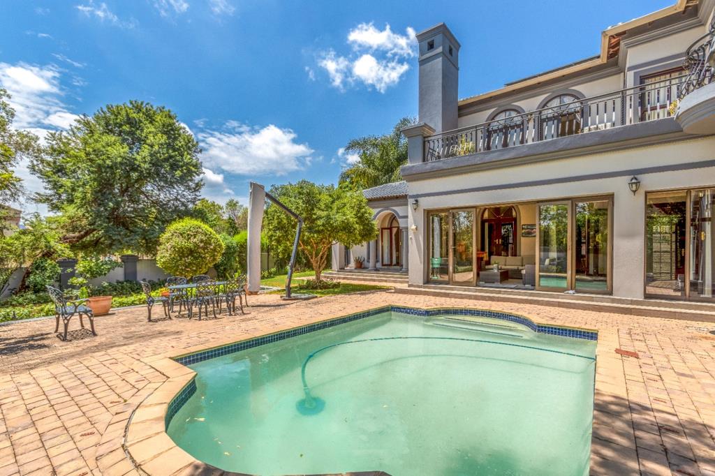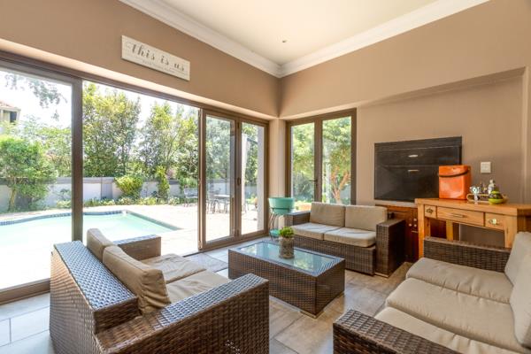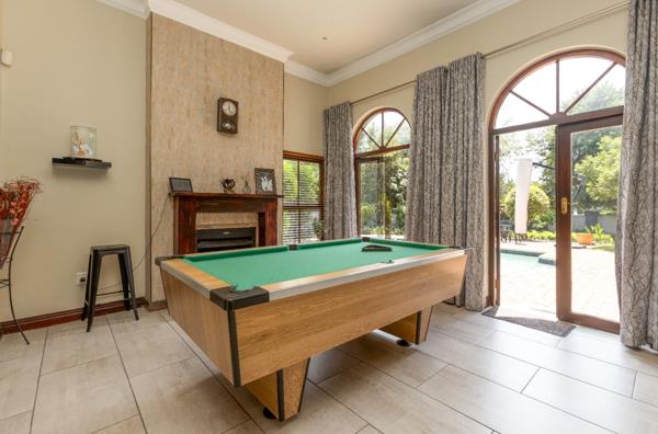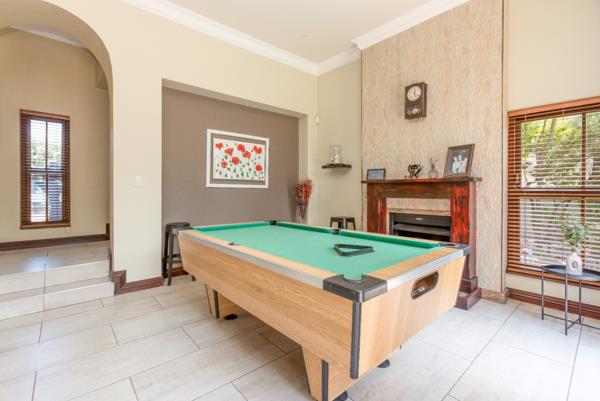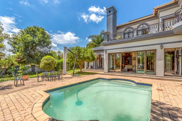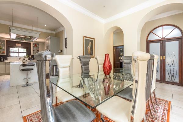 As you step into the entrance hall, you are greeted with a sense of elegance that flows seamlessly throughout the home. The entrance leads to various reception areas, including a large family room, a formal lounge, and a dining room. These spaces effortlessly flow into an enclosed patio, complete with a built-in braai. This patio overlooks a beautifully established garden with a sparkling swimming pool, offering a tranquil setting for outdoor gatherings.