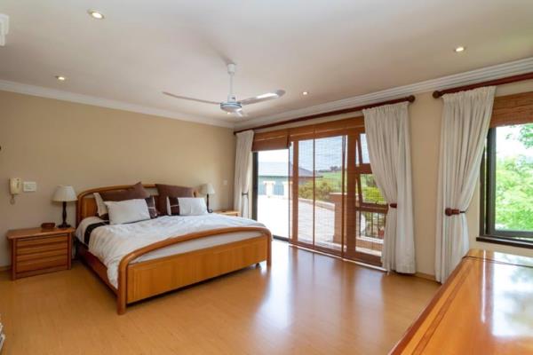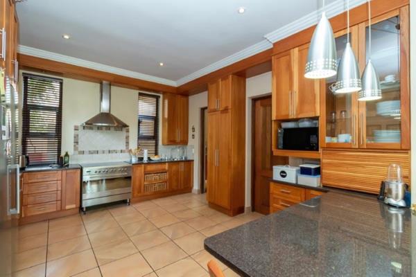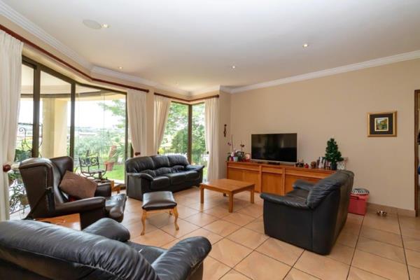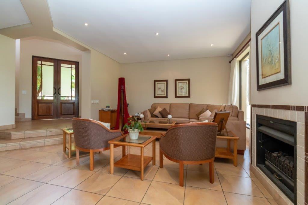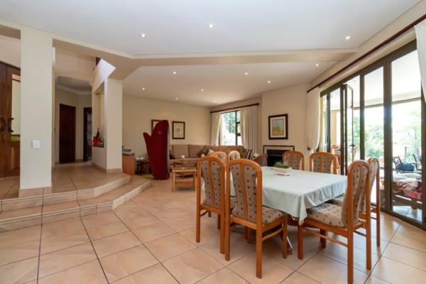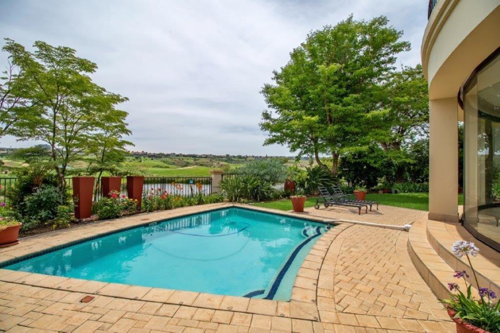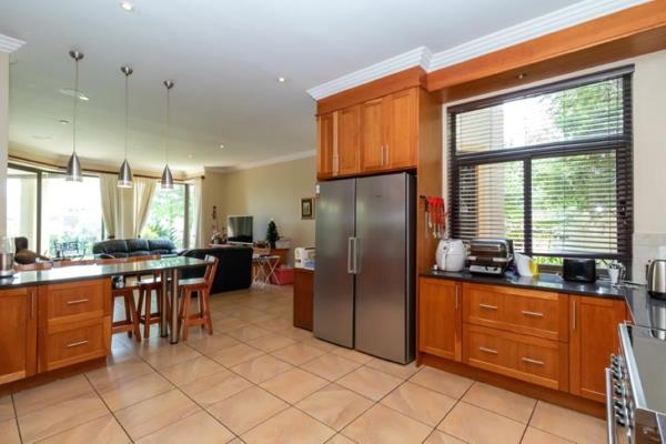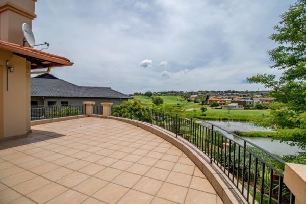 Positioned on a greenbelt with stunning views of the Eagle Canyon Golf Course, this North-facing home is designed for luxury and comfort. The open-plan living spaces include a gourmet kitchen, TV lounge, dining area, and a formal lounge, all opening onto a spacious enclosed patio that leads to a lush garden and swimming pool. A guest bedroom with an en-suite bathroom and a study with garden access complete the ground floor.