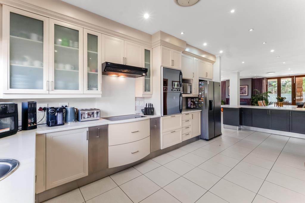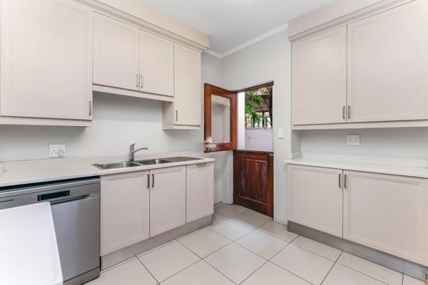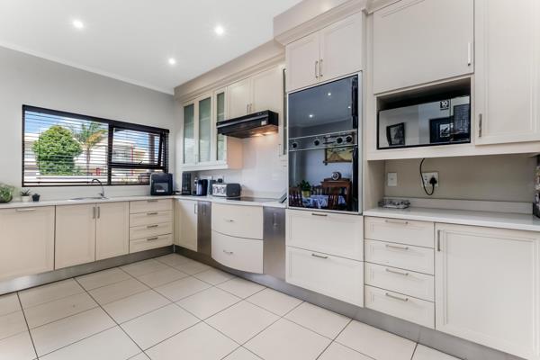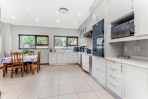The home offers generous living areas including a lounge with built-in fire place, dining room, as well as an entertainment area with a built-in bar, easily adaptable as an extension of the living space. The living areas open out onto a patio which overlooks the swimming pool and garden. The kitchen offers a separate scullery, perfect for easy meal preparation and entertaining.