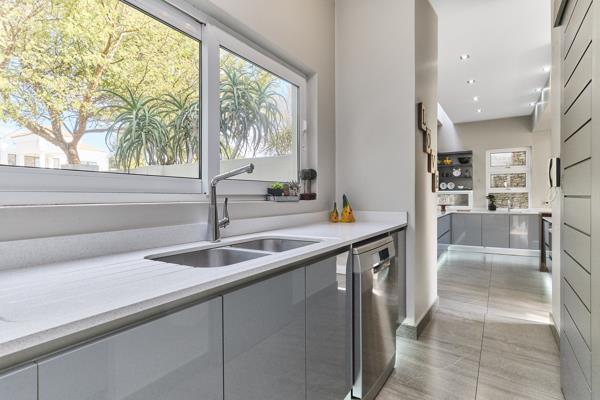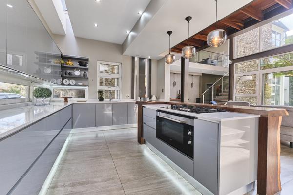 A grand double-volume entrance sets the tone for the expansive open-plan living spaces, anchored by an ultra-modern kitchen featuring a double integrated fridge, built-in microwave and coffee machine, and a skylight that fills the area with natural light. The central living areas are divided by a cozy Nelson fireplace that does not only warms up the living space, but also the upstairs main bedroom. A combined gas and wood braai makes for easy for inside/outside entertaining. The living spaces flow easily into a spacious TV room, ideal for relaxed family gatherings.