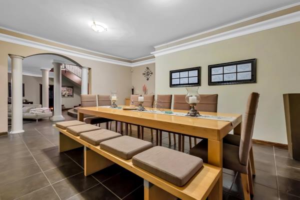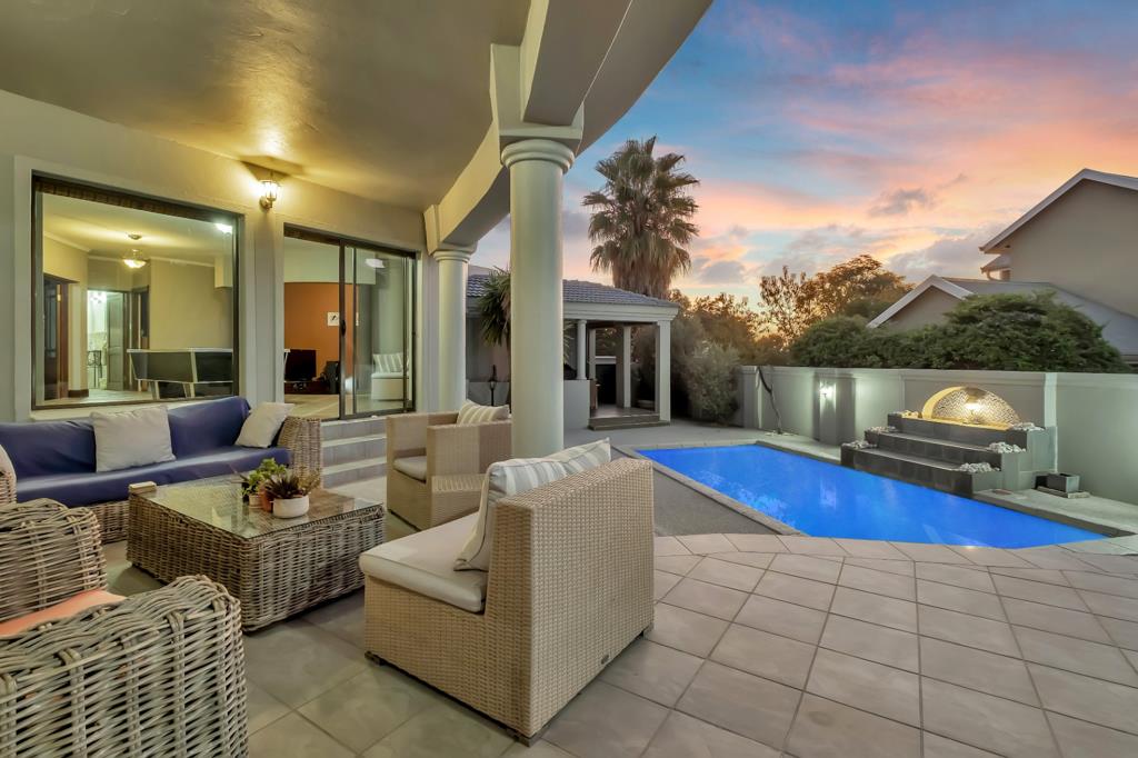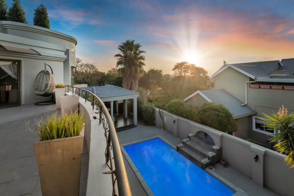 This wonderful North facing home is very spacious and offers great accommodation and plenty of options for entertainment. The receptions include a lounge, dining room, open games room area, cinema room, pub room, kiddies playroom and TV lounge, upstairs pyjama lounge and so much more. Double volume study, with upstairs library is perfect for the business professional. Modern kitchen with separate scullery services the large reception areas. Six bedrooms, all en suite, offer an expansive or multi-generational family, great accommodation. Five bedrooms upstairs all have their own balconies. One bedroom downstairs. The main en suite is extremely spacious with two dressing rooms and a luxurious en suite bathroom. The enormous upstairs balcony, off the pyjama lounge, offers gorgeous sunset views. Downstairs is a large open patio leading to the pool and garden. A covered braai patio, with built in braai, offers space to sit and enjoy the outdoors. A perfect home for a large family or a family who loves to host visitors, extended family and friends from out of town. Staff quarters, double garage with single garage option. This uniquely designed home is perfect for the modern family.