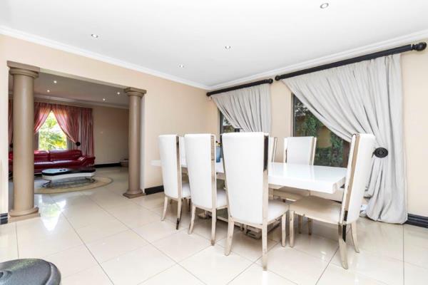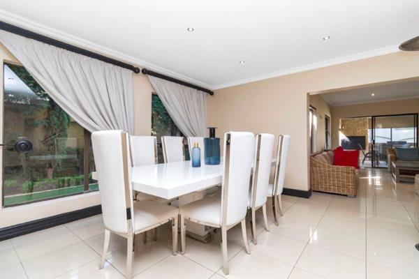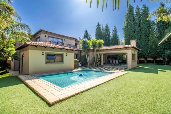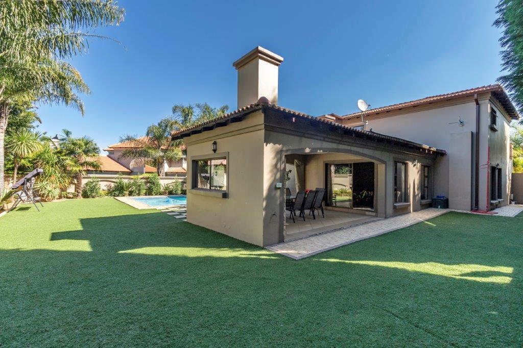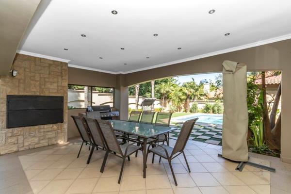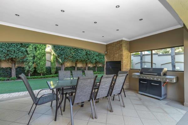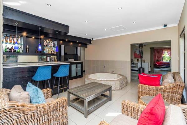 The entertainment area has a flow from the elegant bar room with a jacuzzi to the large covered patio with built in braai accommodating the indooroutdoor flow to the garden with Astro Turf lawn, swimming pool and landscaped garden with a water feature.