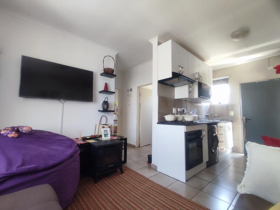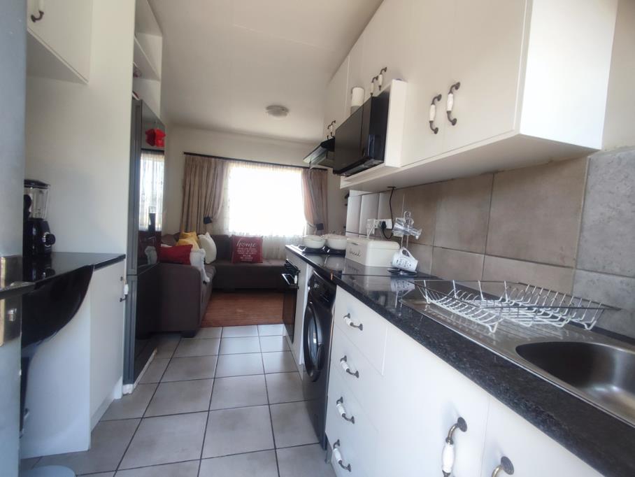 This modern 2-bedroom apartment offers a comfortable and secure living experience in Roodepoort. The open-plan living area seamlessly integrates with a contemporary kitchen, featuring sleek white cabinetry, dark countertops, and tiled flooring throughout for easy maintenance. Integrated appliances, including a stove, extractor, and washing machine, enhance functionality, while a breakfast bar provides a casual dining option. Natural light fills the space, creating a bright and inviting atmosphere.
