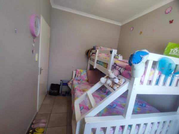 The apartment comprises two well-appointed bedrooms and a single bathroom. The main bedroom benefits from ample natural light and includes substantial built-in wardrobes, offering excellent storage solutions. The second bedroom, currently configured with bunk beds, is ideal for children or guests. Both bedrooms maintain the property''s consistent tiled flooring.