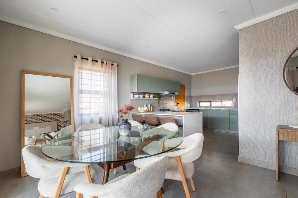 On the ground floor, youll find a spacious open-plan living area that connects the lounge, dining space, and kitchen seamlessly. The kitchen is fitted with a gas stove, giving you reliable and energy-efficient cooking especially useful during load shedding. Sliding doors lead out to your private garden, making it easy to enjoy outdoor time with family and friends.