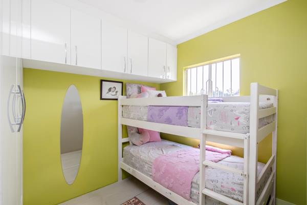 The apartment features two bedrooms, one of which includes built-in cupboards. The bathroom is fitted with a shower, basin, and toilet for practical everyday living.