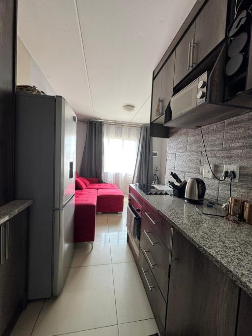 This inviting home offers two well-sized bedrooms with built-in cupboards, a neat bathroom, and an open-plan kitchen and lounge area that creates a warm and functional living space. The kitchen is fitted with modern finishes and ample storage, making everyday living effortless.