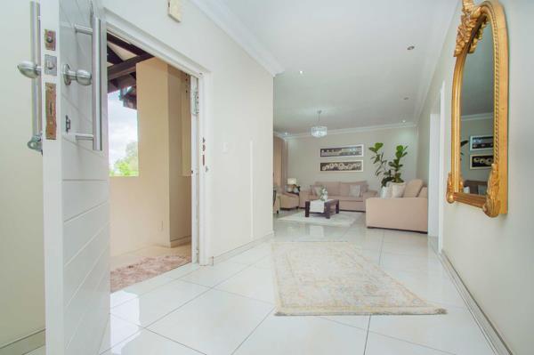 The home continues to impress with a spacious dining area that comfortably accommodates a 12-seater dining suite and flows into a luxurious lounge fitted with decorative wall cladding and a built-in gas fireplace, ideal for cosy evenings.
