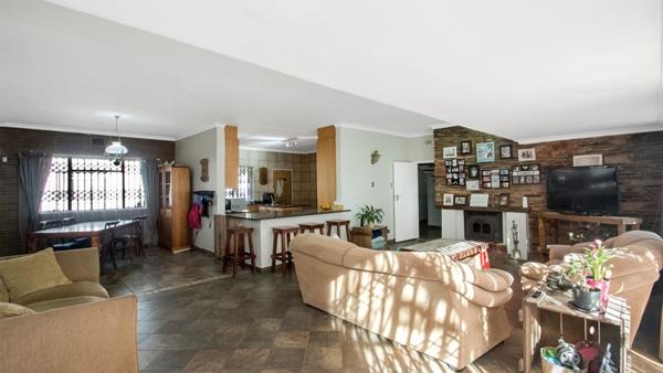 Open plan lounge, dining room and bar with wood fireplace.