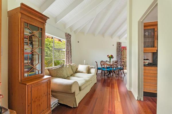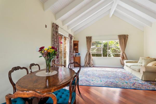 The dining room and lounge are open plan forming one long and big space with sliding doors out to the private garden. Here the bright pink bougainvillea dominates the tranquil and private space.