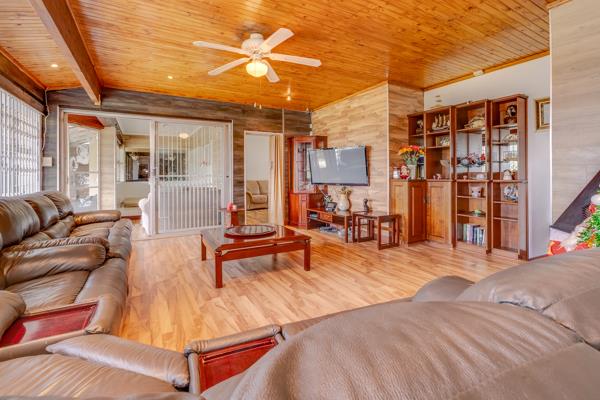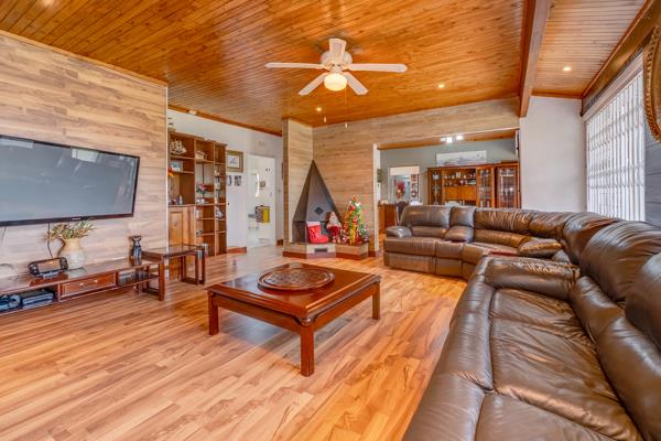 Garden includes a built-in braai, extensive lawn, double-story Wendy house, and a solar-heated swimming pool, all enjoying elevated views