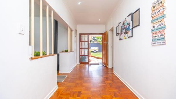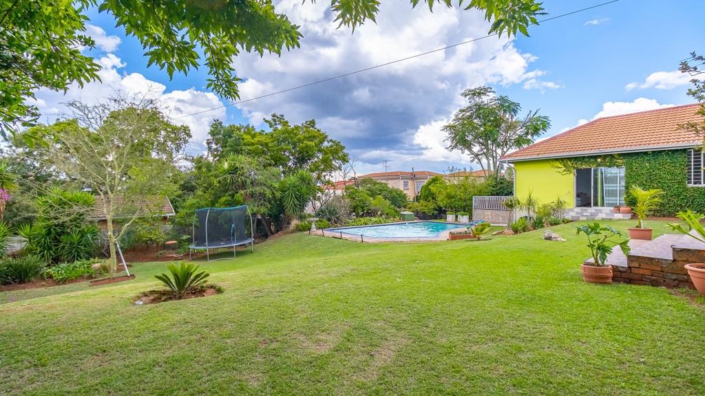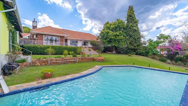 This beautiful property has an open-plan design that seamlessly integrates the lounge, dining, and kitchen areas. The kitchen has built-in cupboards and a scullery. It has a large patio suitable for family and social gatherings, a huge yard, and a stunning garden with a swimming pool.