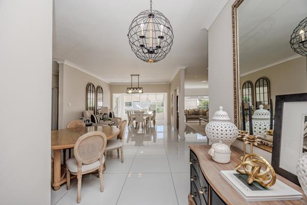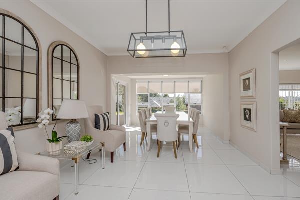 The kitchen is both elegant and practical, complete with a separate scullery and pantry, ensuring functionality while maintaining a sleek and uncluttered aesthetic. The dining area opens onto a large patio that overlooks a beautifully maintained garden perfect for entertaining guests, hosting meetings, or simply enjoying peaceful outdoor moments.