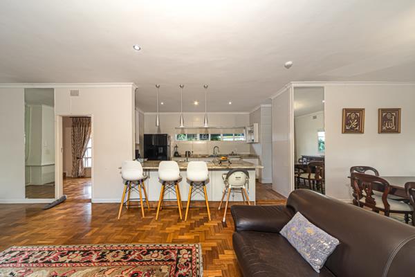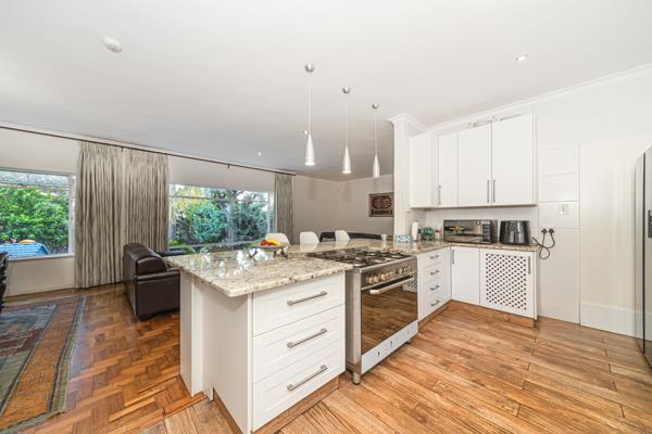This beautifully appointed four bedroom, five bathroom residence offers an exceptional blend of comfort, functionality, and refined living, set on a generous 1,527m² stand with 383m² under roof. Perfectly suited for families, the home showcases warm wooden flooring throughout, enhancing both aesthetic appeal and natural insulation while the open plan layout creates a seamless flow between living spaces. At its heart, a modern kitchen with a striking marble slab island, sleek white cabinetry, ample cupboard space, and elegant pendant lighting connects effortlessly to the dining and lounge areas, making it ideal for both everyday living and entertaining.