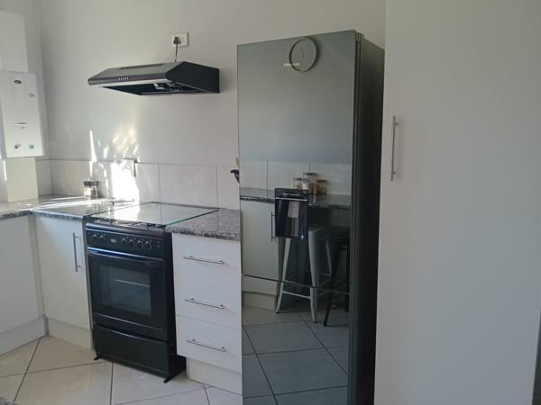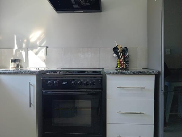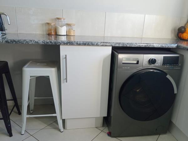 A modern open-plan kitchen with stylish finishes, offering space for a front-loader washing machine, single-door fridge, gas stove, and a cozy breakfast nook.