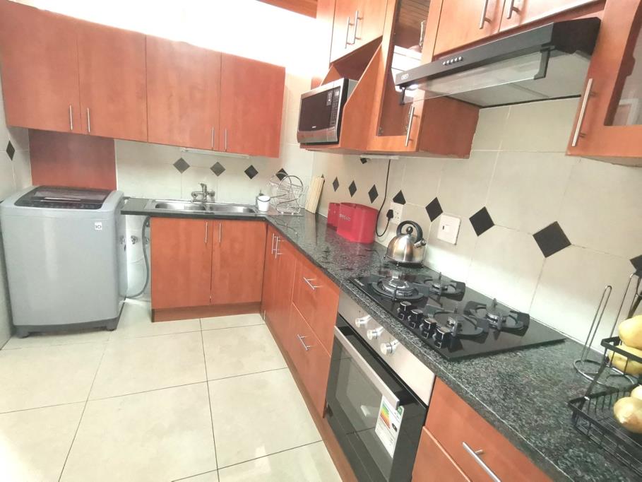 A stylish, fully fitted kitchen with tiled floors and ample cupboards