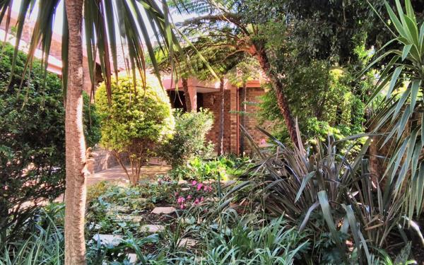 Beautifully landscaped wrap-around garden with paved pathways and flower beds, offering a serene outdoor space.