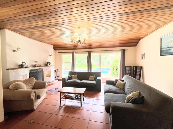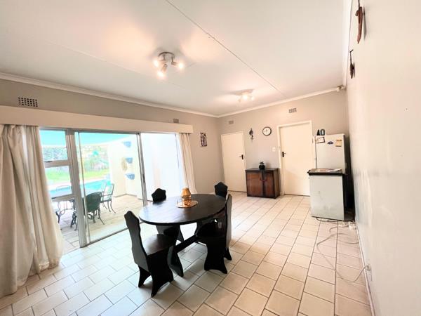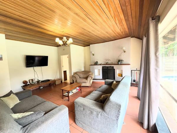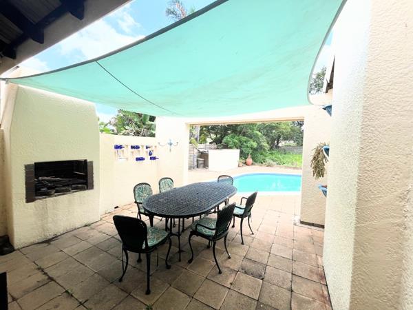 The main bedroom includes a walk-in closet and is conveniently located near the hallway where youll find three bathrooms and a guest toilet. The lounge is spacious and inviting, featuring warm wooden ceilings, a cozy fireplace, and large windows that fill the room with natural light. The dining room is also well-proportioned and fitted with sliding doors that open directly onto the entertainment area, which includes a built-in braai, a well-maintained garden, and the poolperfect for hosting friends and family.