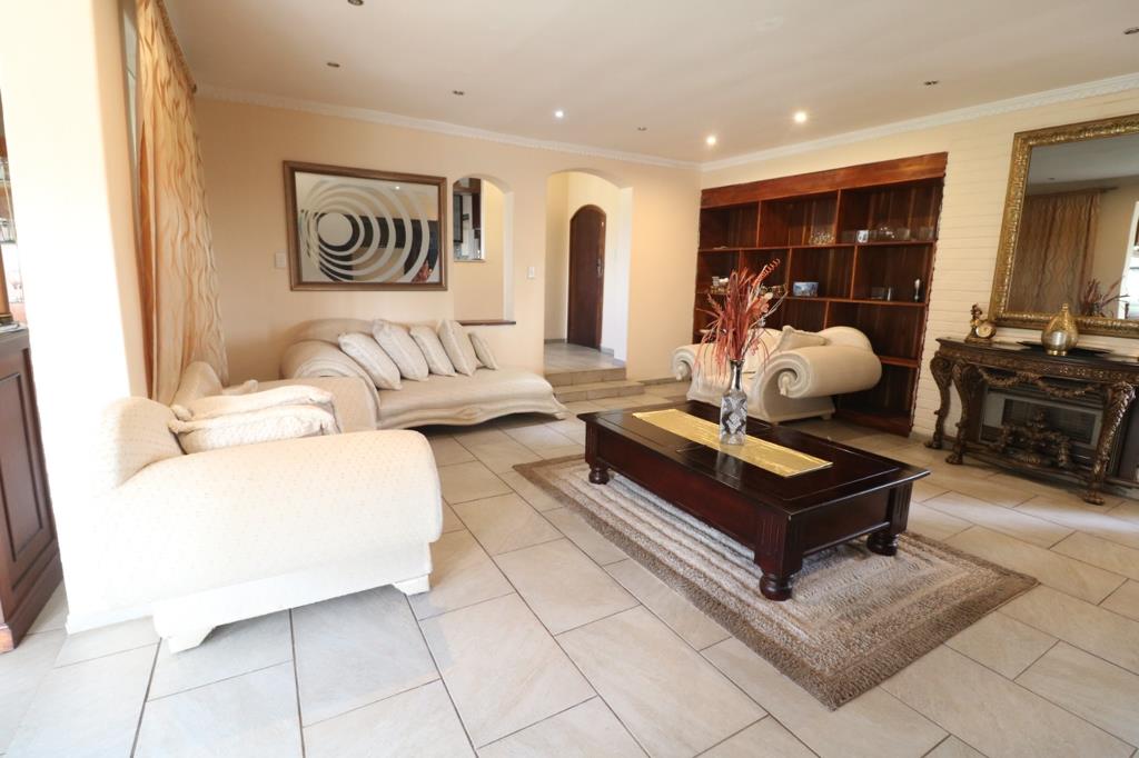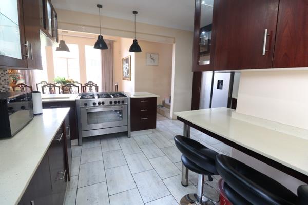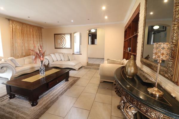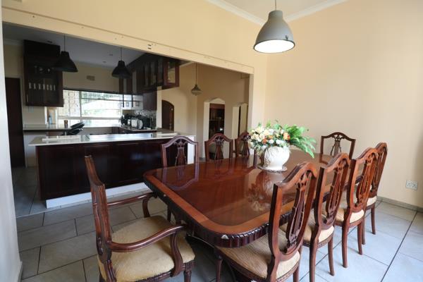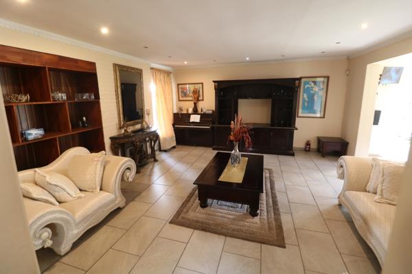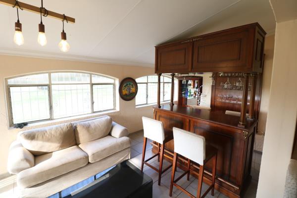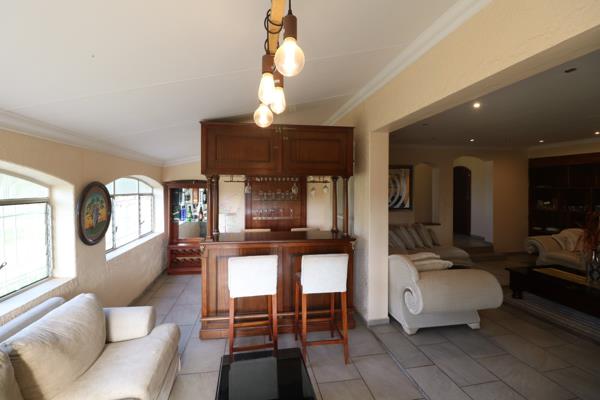 The spacious lounge flows seamlessly into a separate built-in bar area, perfect for entertaining guests or clients while overlooking the lush garden. The expansive outdoor area includes a sparkling swimming pool, lapa with built-in braai, and ample lawn space ideal for hosting or relaxation.