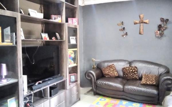 Spacious dining room and lounge with build in wall-unit leading to a covered entertainment area