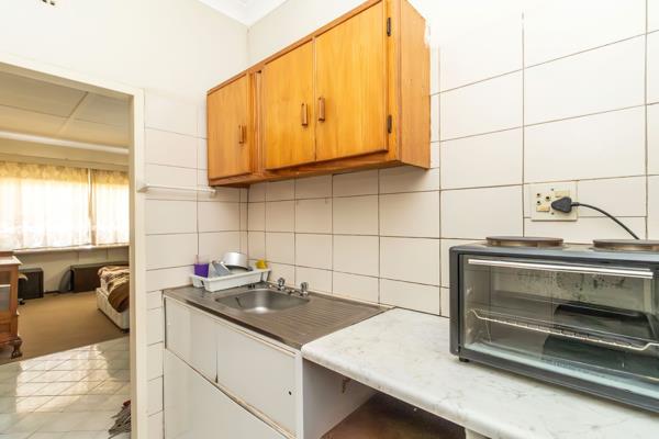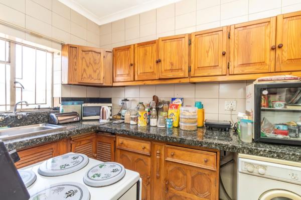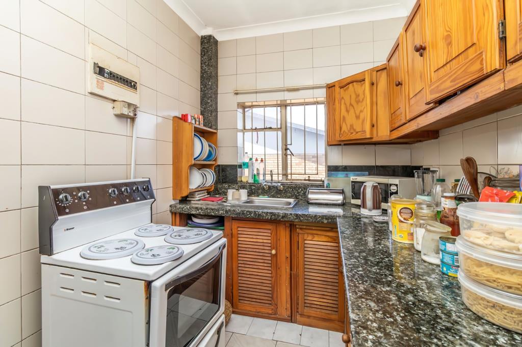 The interior features an open-plan lounge, providing a bright and airy atmosphere with abundant natural light and easy-to-maintain tiled flooring. The main kitchen is functional, equipped with tiled walls, granite-look countertops, and wooden cabinetry, offering good storage and workspace. A unique feature is the inclusion of a second compact kitchen, providing flexibility for dual living arrangements or an additional culinary space.