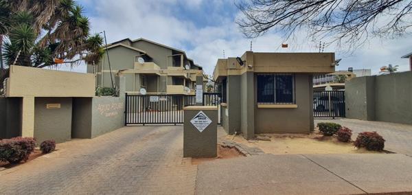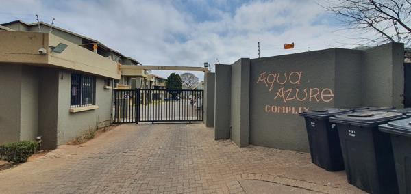 Discover secure suburban living in this well-positioned apartment within the Aqua Azure Complex in Florida, Roodepoort. The complex offers a controlled access environment, featuring a gated entrance with a security guardhouse, 24-hour security, electric fencing, and visible CCTV cameras. Burglar bars on complex windows further bolster security, ensuring a safe residential setting. A paved driveway leads into the complex.
