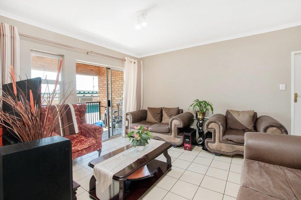 An open plan living area has a sliding door which opens up to a balcony overlooking the property.