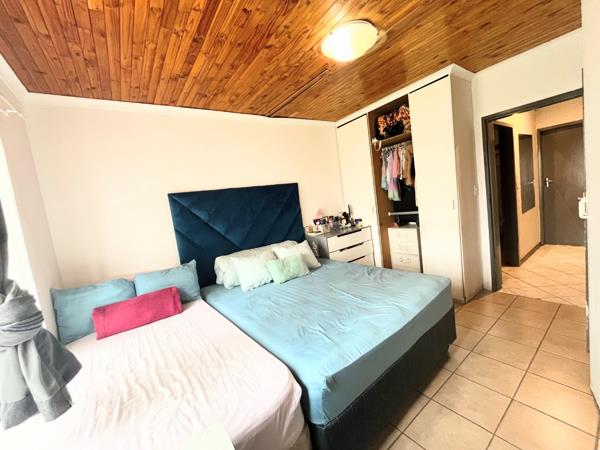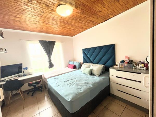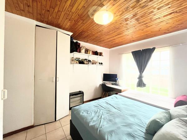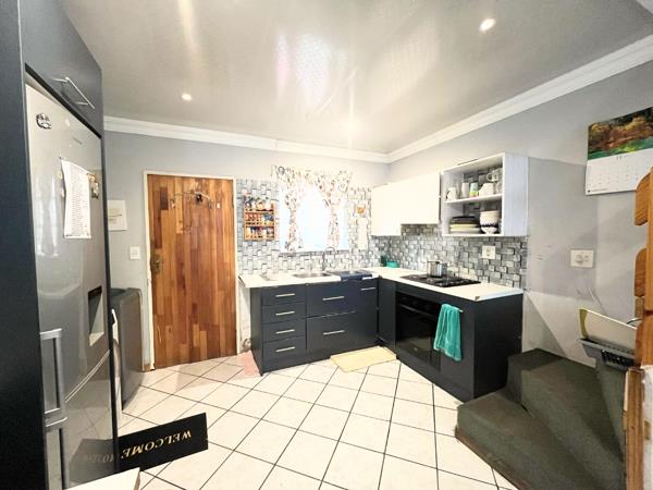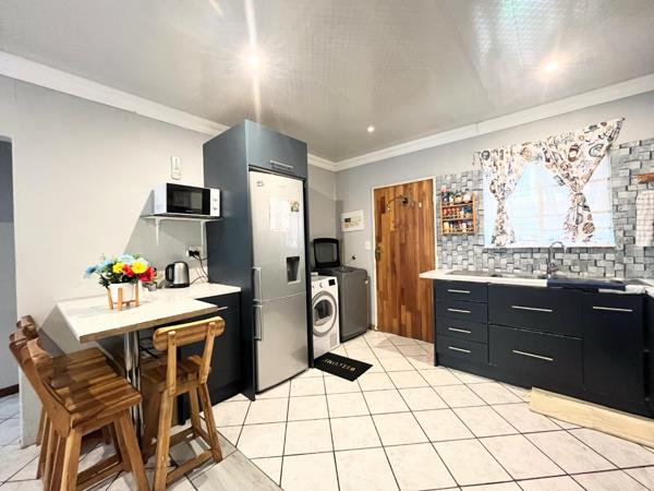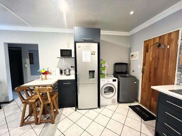 The open-plan kitchen and dining room create a warm, welcoming flow, leading out onto a private back patio complete with a built-in braai, ideal for entertaining. The patio overlooks a neat, manageable garden, perfect for relaxing or hosting family and friends.