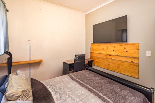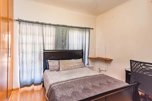 Leading from the lounge is the main bedroom on the right, and on the extreme left is the third bedroom with built-in cupboards. The bathroom and toilet are on the right-hand side of the passage, easily accessible