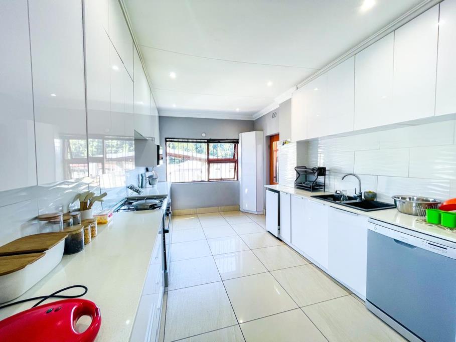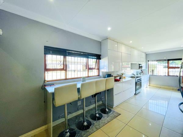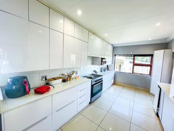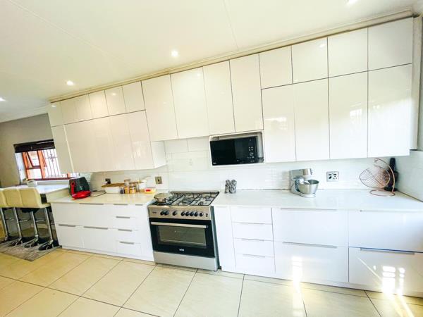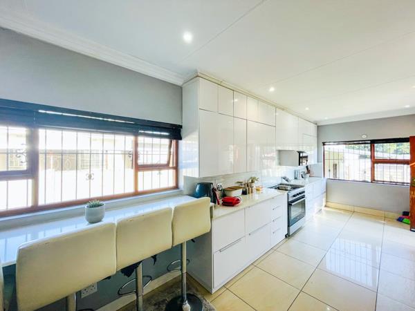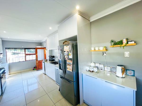 Upon entering, you are welcomed by a dining area near the main entrance, flowing seamlessly into the open-plan lounge and contemporary kitchen. The modern kitchen features sleek white gloss cabinetry, stylish finishes, and a convenient breakfast nook. Large-format modern tiles run throughout the home, enhancing its bright, airy feel while offering easy maintenance.